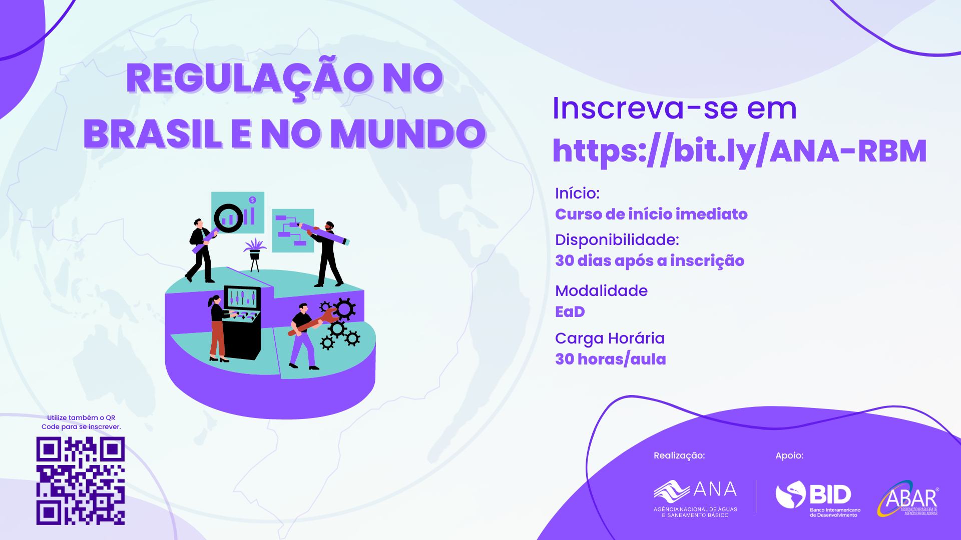 No dia 05 de abril de 2023 foram abertas as inscrições para o curso A Regulação no Brasil e no Mundo, promovido pela Agência Nacional de Águas e Saneamento Básico (ANA), e desenvolvido em parceria com o Banco Interamericano de Desenvolvimento (BID), a Associação Brasileira de Agências de Regulação (ABAR) e o Centro de Estudos de Regulação e Governança dos Serviços Públicos da Unesp. O curso é aberto a quem quiser participar e a carga horária é de 30h.